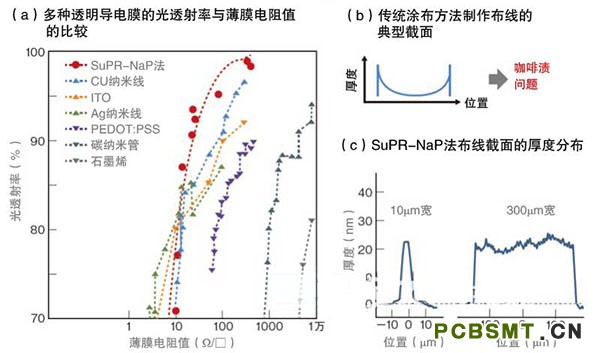(a)SuPR-NaP法與現在的透明導電膜的光透射率、薄膜電阻值的比較。越靠近左上方,透明導電膜的性能越高。SuPR-NaP法在薄膜電阻率為20Ω/□時,光透射率高達93%。(b)使用以往的涂敷方法,會出現布線等的邊緣較厚的“咖啡漬問題”。(c)用SuPR-NaP法加工任何布線寬度,布線的厚度都基本固定。