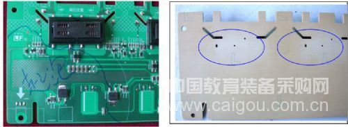 圖1 爆板樣品的局部 圖2 失效樣品背面的局部外觀(淺色部分對應的另一面為大器件―電磁繼電器)