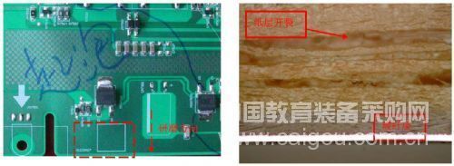 該批樣品為CEM1 類型板材,無鉛回流焊后發生爆板失效,概率達3%左右,樣品呈長條型,其中有一排較大地電磁繼電器(見圖1)。爆板的區域集中在元器件分布少的部位,且該部位和對應的背面的顏色較黃,顏色較其他部位要明顯深(圖2)。通過切片分析發現,爆板發生的區域內部PCB 基材分層在紙質層。用近似批次的樣板按照進行熱應力試驗,在260℃下由10 秒到30 秒都沒有發現類似的爆板失效,試驗后的樣品的顏色也沒有實際失效的樣品深。同時用熱分析方法(TGA 和DSC)對爆板區域的材質進行,發現該材質的熱分解溫度和玻璃態轉化溫度均符合材質的技術規范。根據以上分析,可以推斷該無鉛回流焊組裝工藝的條件超出了該類型PCB 的技術要求,回流時為了保證吸熱的大器件的焊點合格或良好,設置的工藝參數主要是焊接的溫度與時間過高過長,導致元器件少或空白的區域局部溫度超過該類型板材的技術規范,終導致產品爆板失效。該失效與板材本身無關,而與材質的選用、設計以及焊接工藝有關。