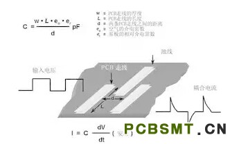 圖5 在PCB上布兩條靠近的走線,很容易形成寄生電容。由于這種電容的存在,在一條走線上的快速電壓變化,可在另一條走線上產(chǎn)生電流信號