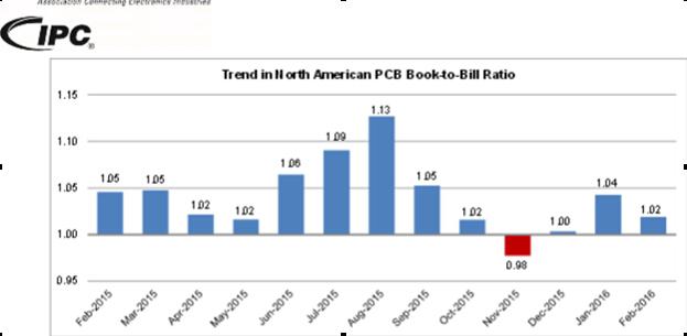 2016年3月31日,IPC發(fā)布《2016年2月份北美地區(qū)PCB行業(yè)調研統(tǒng)計報告》。報告顯示,2月份PCB銷量反彈,強于訂單量,訂單出貨比由此回落至1.02。 2016年2月份北美PCB總出貨量,與20