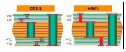 推薦使用深度多6層的盲孔/埋孔配置。層數再多會引起制造良率問題。優選技術是使用交叉過孔或堆疊過孔,如圖8所示。交叉過孔允許更加精確的注冊公差,因為它們不像堆疊過孔那樣強制要求完美對齊。