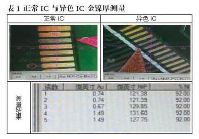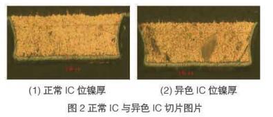 從以上異常IC與正常IC金厚測試數(shù)據(jù)得出,異常IC與正常IC鎳厚無明顯差距,但異常IC金厚比正常IC金厚大相差0.82微英寸,因此可以判定IC異色為金厚過薄呈現(xiàn)鎳的顏色所致。