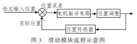 如圖3滑動模塊流程示意圖所示,本系統方案設計在傳輸系統和smt生產設備的連接處,增設一個滑動裝置,主要由滑動板、滾珠和位置傳感器組成,形成了一個閉環控制,起到平衡作用。在生產過程中,由模塊裝置上的位置傳感器實時將實際位置信號反饋給系統,與給定輸入位置信號相比較產生一個位置誤差信號,然后由這個誤差信號驅動電機運轉進行位置調整。當設備平衡時,位置誤差為零,不進行位置調整;當傳輸機有偏斜時,位置誤差不為零,由它驅動電機運轉,使設備進行一定的位置調整。通過這套裝置,消除由振動產生位置偏移、利于整個生產線的生產、增強各設備之間銜接。