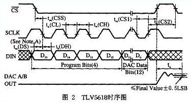 TLV5618是TI公司帶緩沖基準輸入(高阻抗)的雙路12 位電壓輸出DAC,通過CMOS 兼容的3線串行總線實現數字控制。器件接收16 位命令字,產生兩路D/A模擬輸出。TLV5618只有單一I/O周期,由外部時鐘SCL K決定,延續(xù)16 個時鐘周期,將命令字寫入片內寄存器,完成后即進行D/A轉換。TLV5618讀入命令字是從CS的下降沿開始有效,從下一SCLK的下降沿開始讀入數據,讀入16位數據后即進入轉換周期,直到下次出現CS的下降沿。 其操作時序圖如圖2 所示。