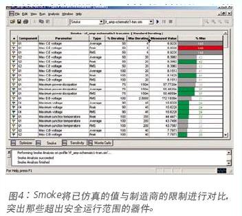 Smoke選項可以對電能耗散,連接點溫度增加,二次崩潰,或電壓/電流限制違例引起受壓的部件做出預(yù)警,經(jīng)過一定時間, 這些部件可能導(dǎo)致電路失敗,設(shè)計師可以用Smoke將電路仿真結(jié)果和部件的安全運行限制進行對比,如果超過限制,Smoke 就可以識別問題參數(shù),使用Smoke分析還可用于創(chuàng)建,修改和配置供使用的decrate 文件,見圖4。