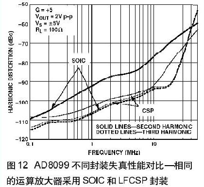 這種引腳排列還有一個好處就是降低了二次諧波失真。傳統(tǒng)運(yùn)算放大器的引腳配置中引起二次諧波失真的一個原因是同相輸入和負(fù)電源引腳之間的耦合作用。LFCSP封裝的低失真引腳排列消除了這種耦合所以極大地降低了二次諧波失真;在有些情況下多可降低14 dB。圖12示出了AD80992 采用SOIC封裝和LFCSP封裝失真性能的差別。