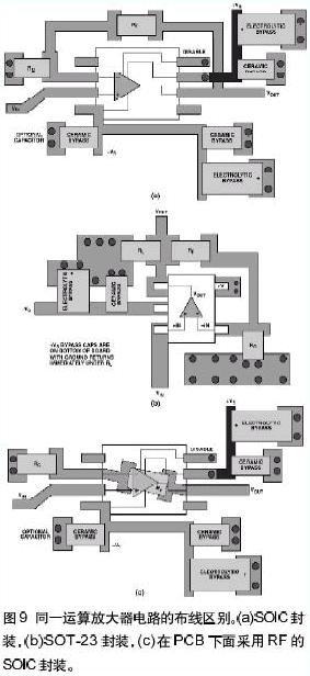 圖9示出了采用SOIC封裝(a)和SOT-23封裝(b)的運(yùn)算放大器之間的布線區(qū)別。每種封裝都有它自身的一些問題。重點(diǎn)看(a),仔細(xì)觀察反饋路徑就發(fā)現(xiàn)有多種方法連接反饋。重要的是保證印制線長度短。反饋路徑中的寄生電感會引起振鈴和過沖。在圖9(a)和9(b)中,環(huán)繞放大器連接反饋路徑。圖9(c)示出了另外一種方法——在SOIC封裝下面連接反饋路徑——這樣就減小了反饋路徑的長度。每種方法都有細(xì)微的差別。一種方法會導(dǎo)致印制線過長,會增大串聯(lián)電感。二種方法采用了通孔,會引起寄生電容和寄生電感。在給PCB布線時必須要考慮這些寄生效應(yīng)的影響及其隱含的問題。SOT-23布線差幾乎是理想的:反饋印制線長度短,而且很少利用通孔;負(fù)載和旁路電容從很短的路徑返回到相同的地線連接;正電源端的電容(圖9(b)中未示出)直接放在PCB背面的負(fù)電源電容的下面。