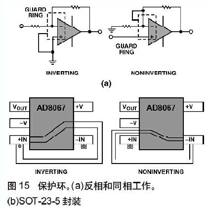 保護(hù)環(huán),或者說“隔離環(huán)”,是運(yùn)算放大器常用的另一種屏蔽方法,它用于防止寄生電流進(jìn)入敏感結(jié)點(diǎn)。其基本原理很簡單——用一條保護(hù)導(dǎo)線將敏感結(jié)點(diǎn)完全包圍起來,導(dǎo)線保持或者迫使它保持(低阻抗)與敏感結(jié)點(diǎn)相同的電勢,因此使吸收的寄生電流遠(yuǎn)離了敏感結(jié)點(diǎn)。圖15(a)示出了用于運(yùn)算放大器反相配置和同相配置中的保護(hù)環(huán)的原理圖。圖15(b)示出用于SOT-23-5封裝中兩種保護(hù)環(huán)的典型布線方法。