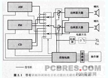 例如,在設計一個(模擬)光碟(CD) 機或者數(shù)字光碟(DVD) 機的電路時,在整個電器裝置的印制線路板中,既有模擬電路又有數(shù)字電路,這時候應當特別注意不要讓數(shù)字電路的信號干擾模擬電路的正常工作。為此,往往將這類電路原理圖首先分割成各部分分別具有不同功能的方框圖,并且明顯地標識出哪些導線是信號線,哪些導線是電摞線,哪些導線是接地線或屏蔽線。圖2. 1 是將一個帶有調(diào)幅和調(diào)頻收音機接收功能的光碟機方框圖分別標識出信號線、電源線與接地線的例子。