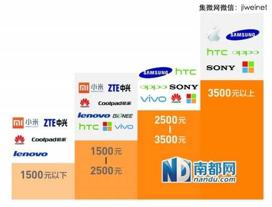 如此一來(lái),市面上3500元以上價(jià)位的品牌僅剩下蘋(píng)果(108.6, -0.80, -0.73%)、三星和H T C 3家,而高端市場(chǎng)的多樣化需求卻仍然存在。誰(shuí)來(lái)填補(bǔ)空位?在“沖高”征程上苦苦奮斗了10年的產(chǎn)品牌們,仿佛見(jiàn)到了前所未有的市場(chǎng)機(jī)遇。