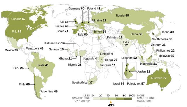 據美科技媒體Mashable近日引述皮尤機構的一份報告稱,發展中家的智能手機普及率已經增加到了37%。