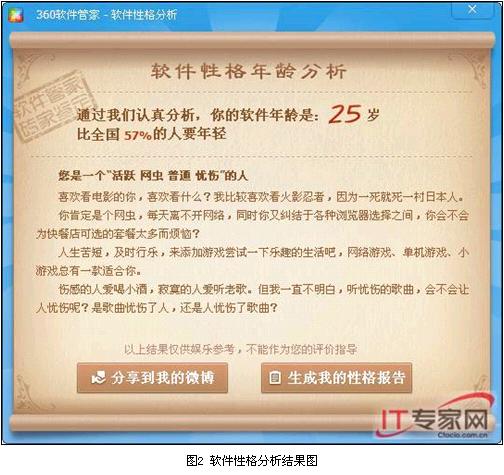 小編還發(fā)現(xiàn),360軟件性格分析還能分析出我們的軟件年齡,如小編只有25歲(竊喜),說明人老心不老哦。可這軟件年齡是怎么得出來的呢?小編猜測是根據(jù)安裝軟件的歷史,比如電腦中安裝了WinZip等這類老古董的軟件,電腦會更給你加幾歲;如果像小編360都時刻更新新的豆瓣電臺,那年齡理應(yīng)比較年輕了。
