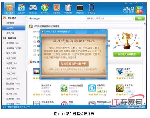 這結(jié)果給力準(zhǔn)確嗎?神不神馬,小編馬上一試便知。安裝360安全衛(wèi)士8.5beta版后,一次運(yùn)行360安全衛(wèi)士,進(jìn)入“軟件管家”,“360心理學(xué)磚家”會立刻彈出一個“軟件性格分析”提示(如圖1)。